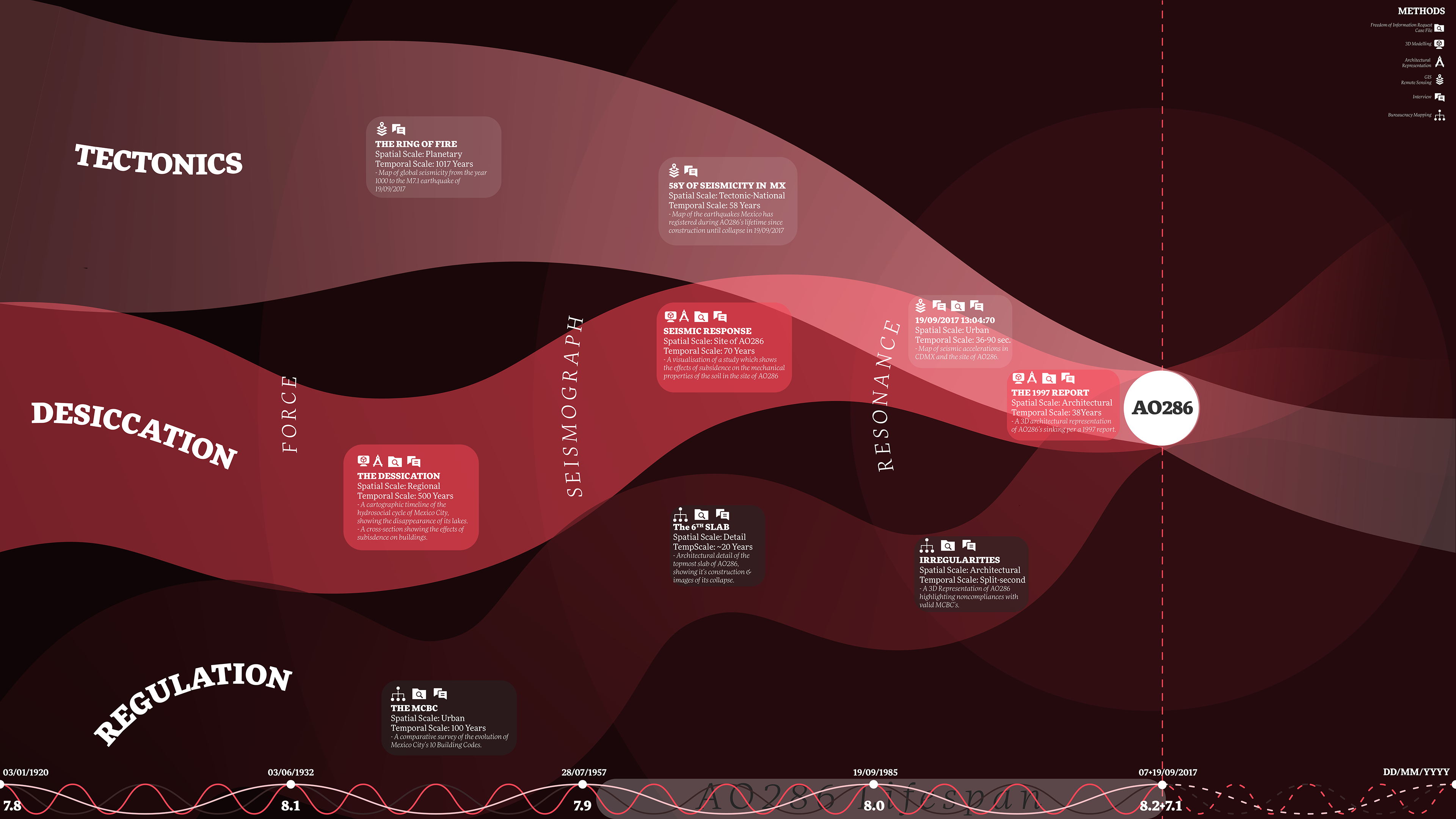 On the 19th of September 2017, an earthquake of magnitude 7.1 hit Mexico City, leading to the collapse of the seven storey building located on 286 Álvaro Obregón Avenue, or AO286, causing the death of 49 people. Resonant Collapses is an investigative platform that articulates forces of tectonic plates, lake desiccation, and building code regulations to reveal seismic destruction not just as the result of earthquakes, but also as a complex event entangled with environmental violence and institutional negligence. Resonant Collapses presents spatial and cartographic timelines, regulatory databases and architectural representations at interscalar jumps across time, from five centuries of colonial control of water to the split-second of the collapse of AO286; and across space, from the planetary processes of tectonics to the constructive detail of a slab, to contribute to the public and political conversation which addresses the question: Why did AO286 collapse?